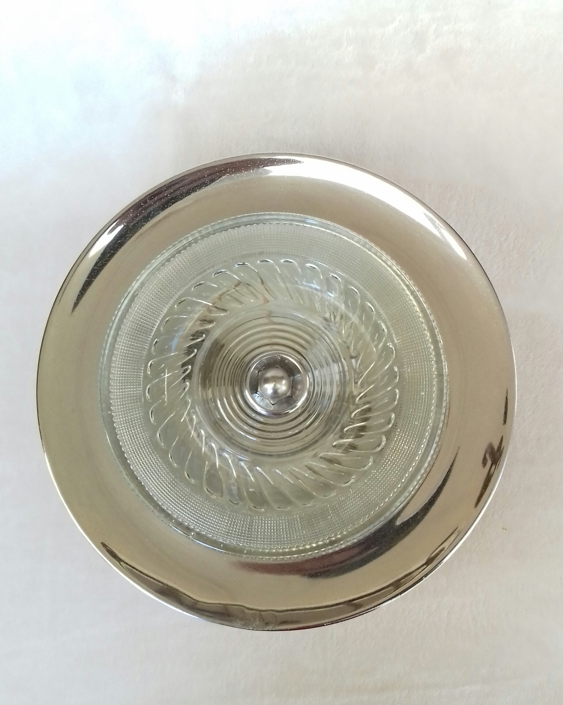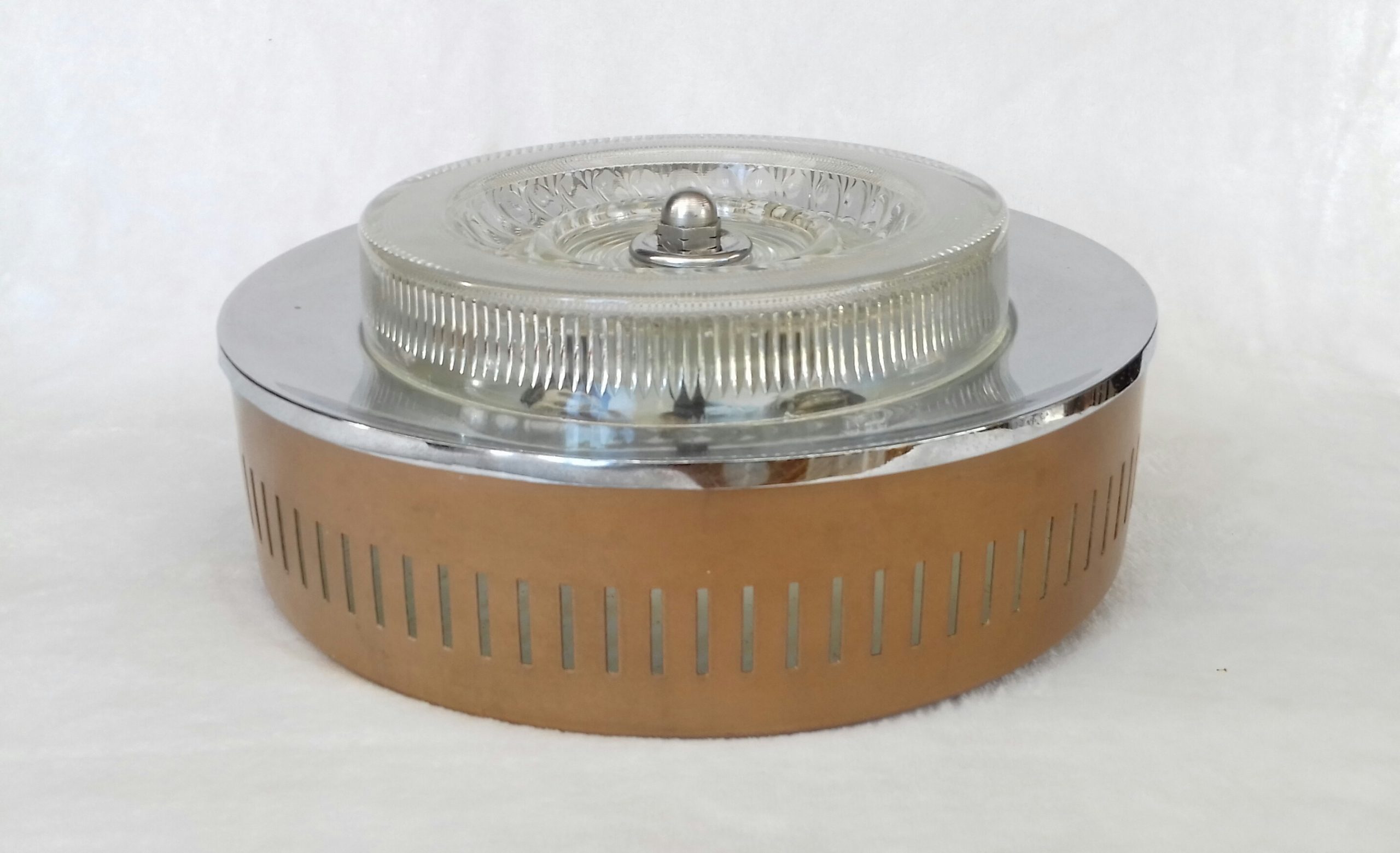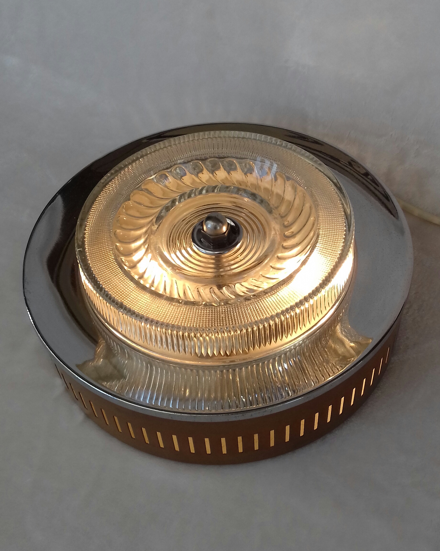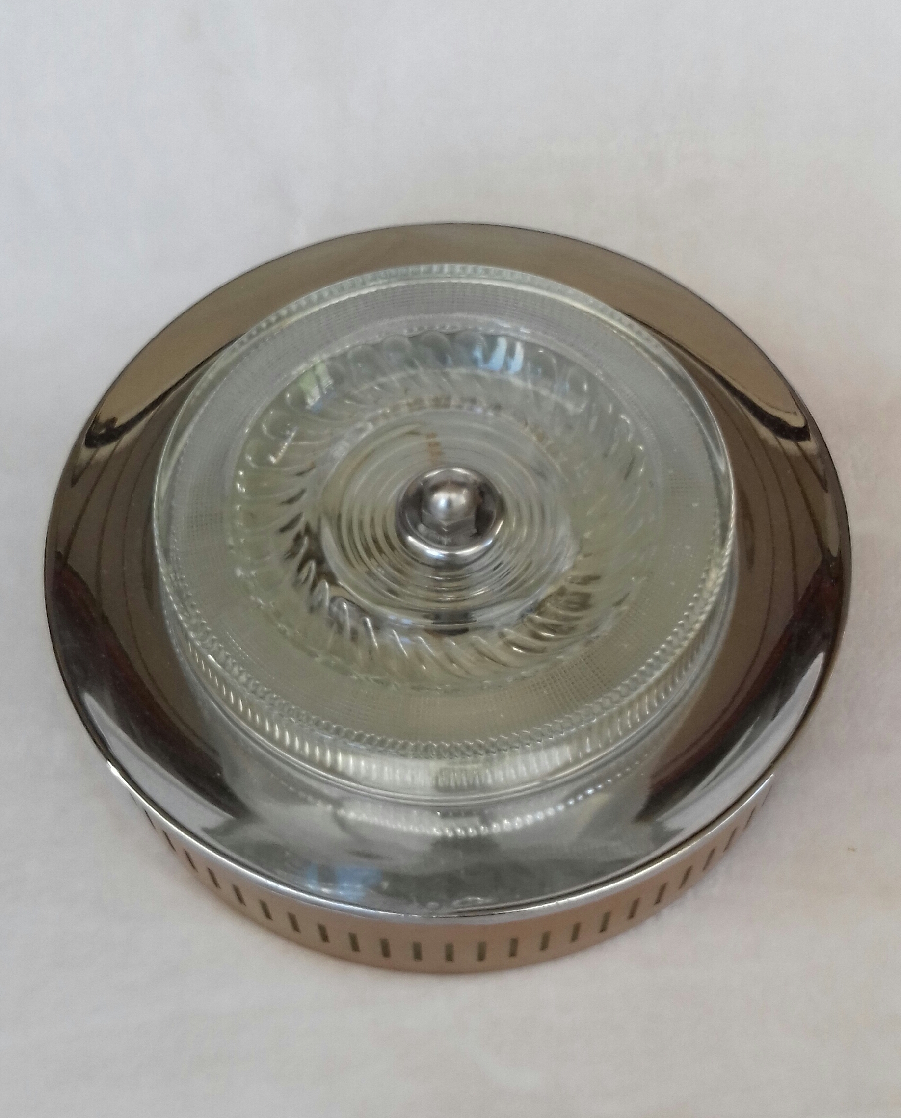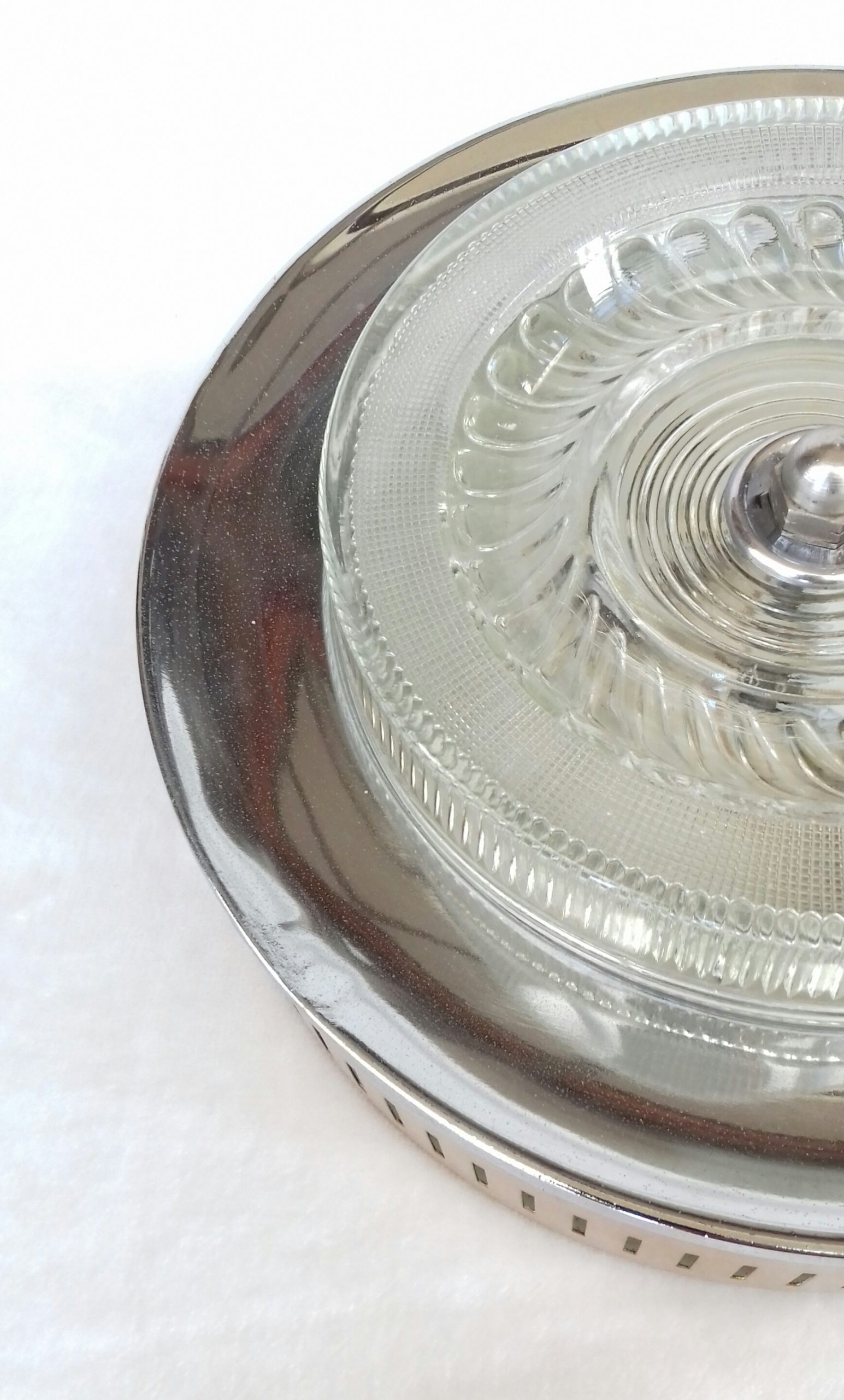 Plafón de techo de diseño original. Cristal prensado y metal. Años '60. Se encuentra en buen estado. Tiene un pequeño rozón en el aro metálico.