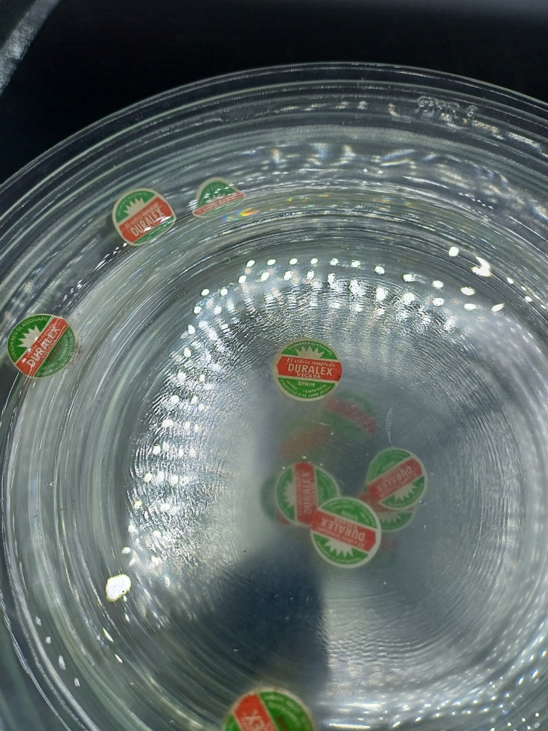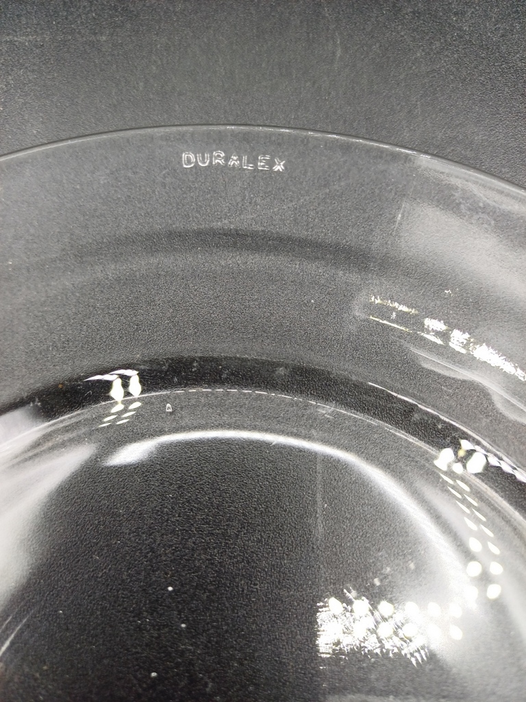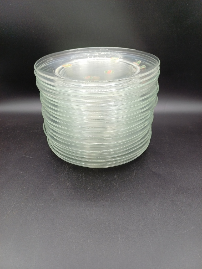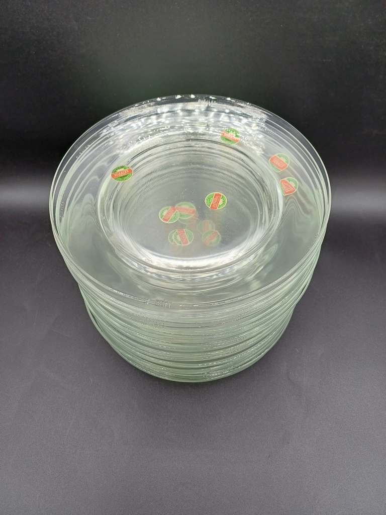 Lote de 22 platos de cristal transparente de la marca Duralex. A estrenar, aún con sus pegatinas originales. Diámetro del plato: 19 cm.