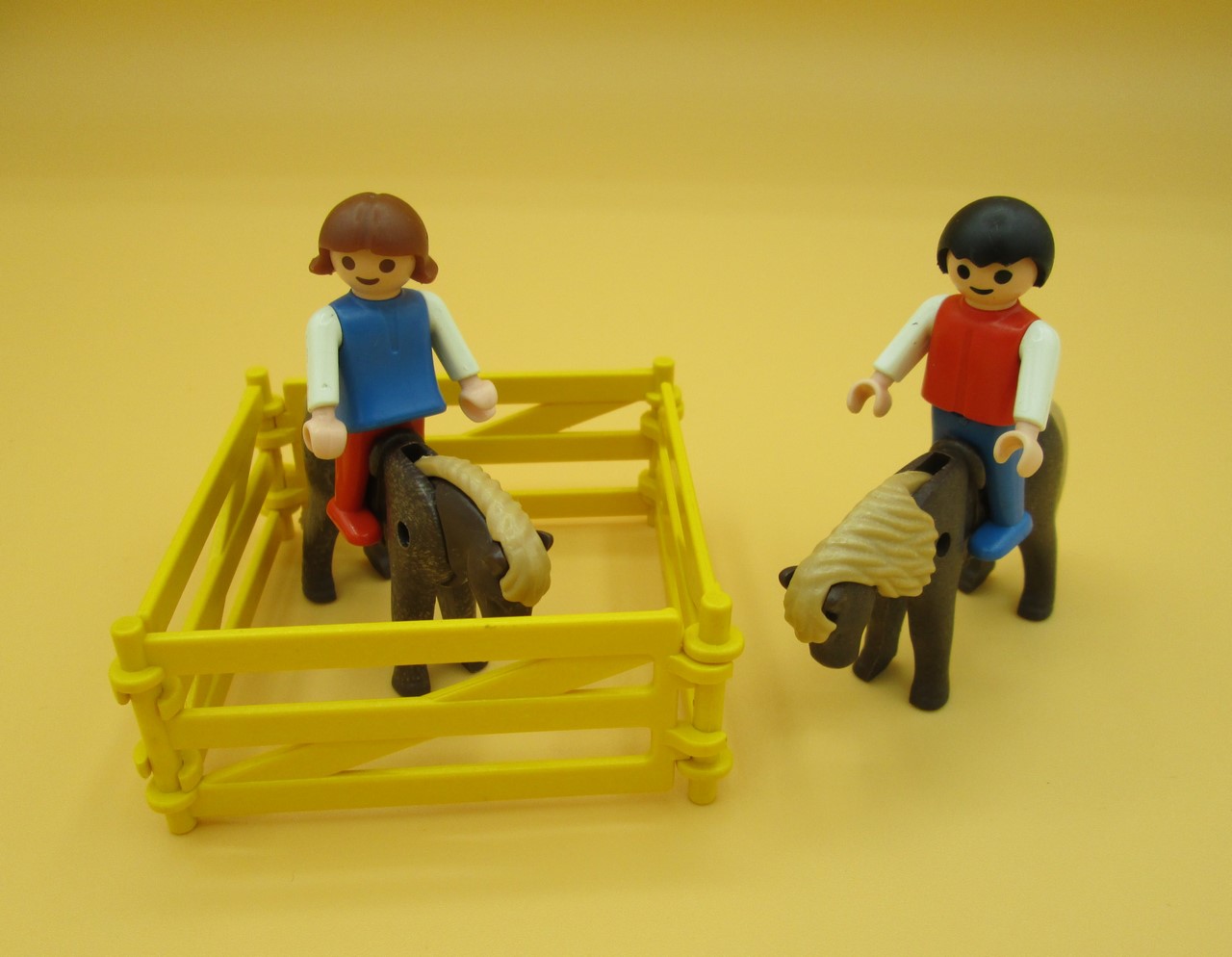 Conjunto de dos niños (5cm) a caballo con vallado. Playmobil, 1981, Geobra.