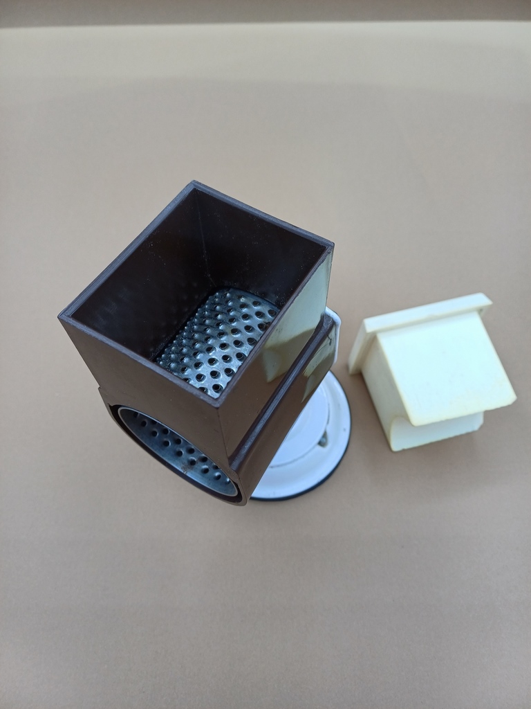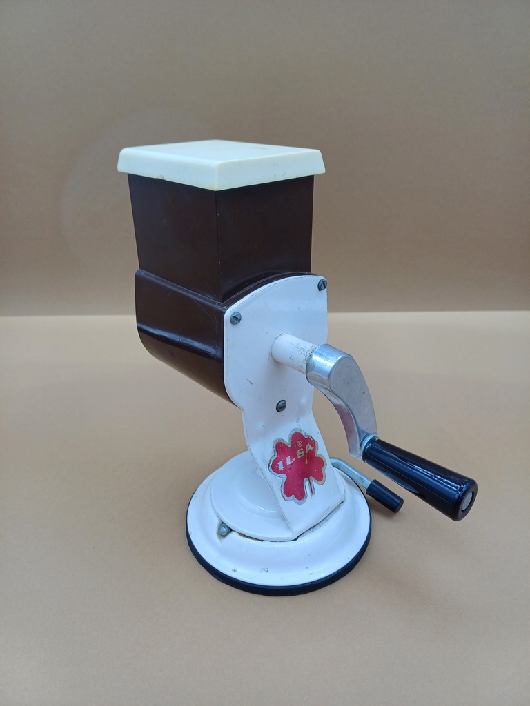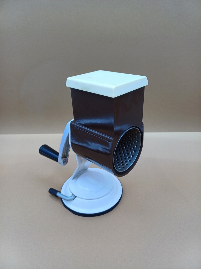 Antiguo rallador marca Ilsa para queso, pan, verduras, etc. En buen estado de conservación y con su tapadera original. La ventosa no funciona correctamente. 19 cm de altura, 17 cm de ancho (incluida manivela).