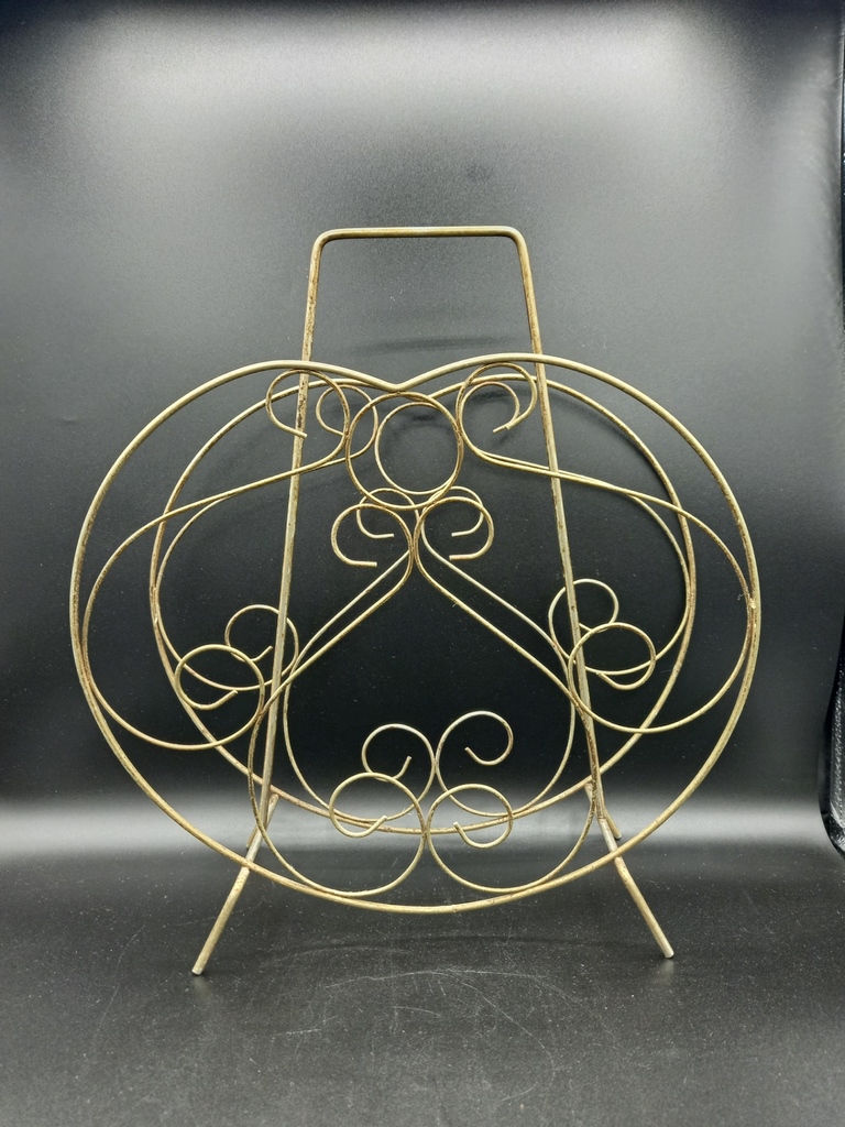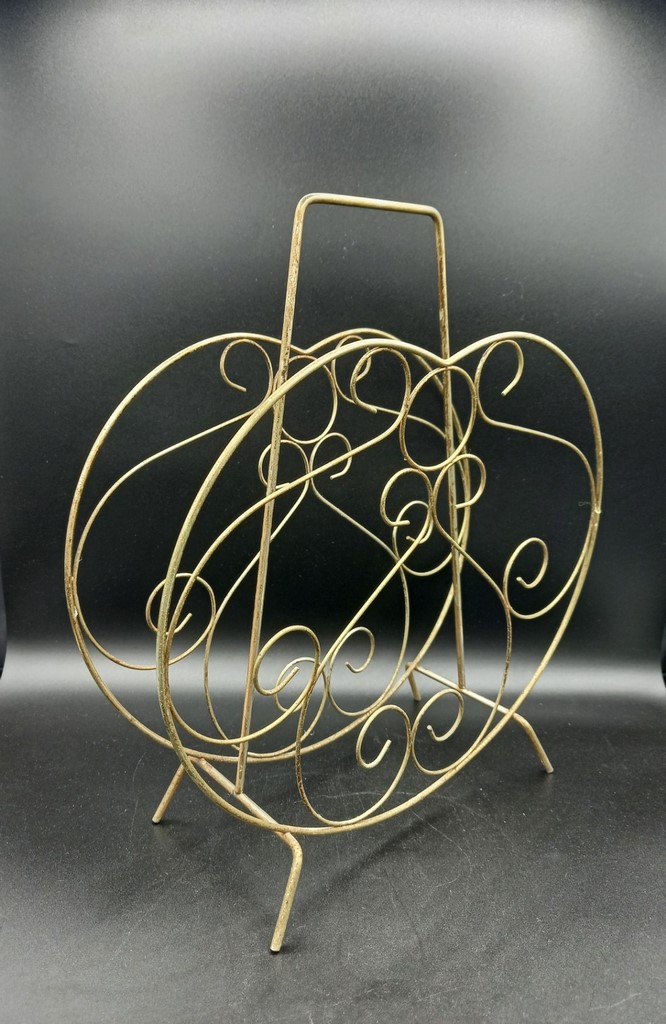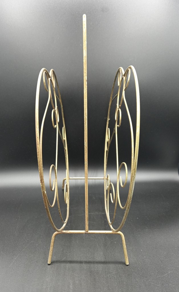 Revistero vintage de metal en color dorado. Muy decorativo. Tiene el asa en medio y las revistas se colocan a ambos lados. Medidas: 40 cm de alto, 13 cm de ancho y 34 cm de largo.