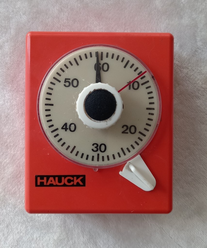 Temporizador para cocina marca Hauck. Programable hasta 60 minutos. Para colgar en la pared. Tamaño: 11 cm x 9 cm. Funciona.