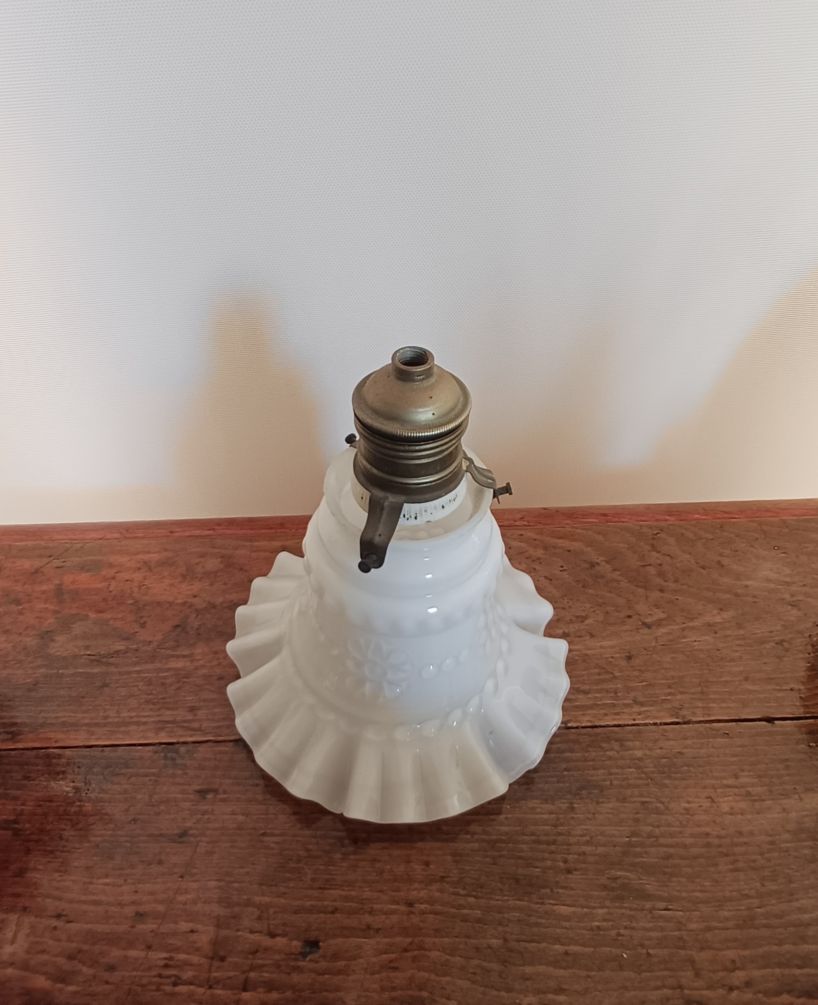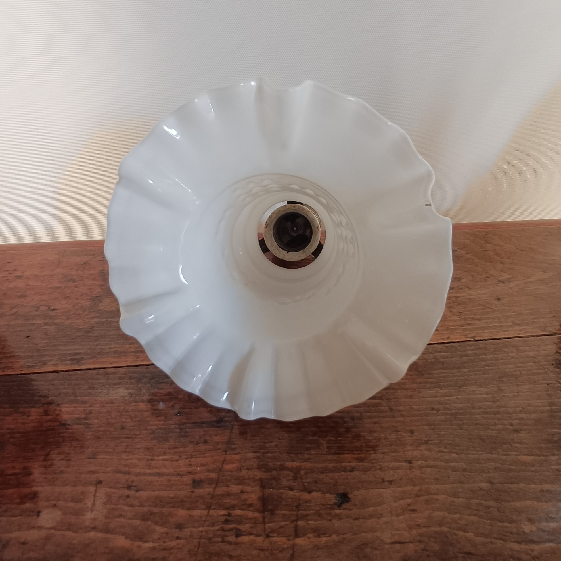Preciosa pantalla de lámpara antigua de opalina blanca. Es una pieza delicada y elegante, ideal para dar un toque vintage a tu hogar. - Presenta un diseño con ondas y volantes en la base. - Tiene un bonito relieve floral en la parte superior. - Incluye la araña y el casquillo metálico original. Medidas: ancho de tulipa 15,5 cm, altura 17 cm.