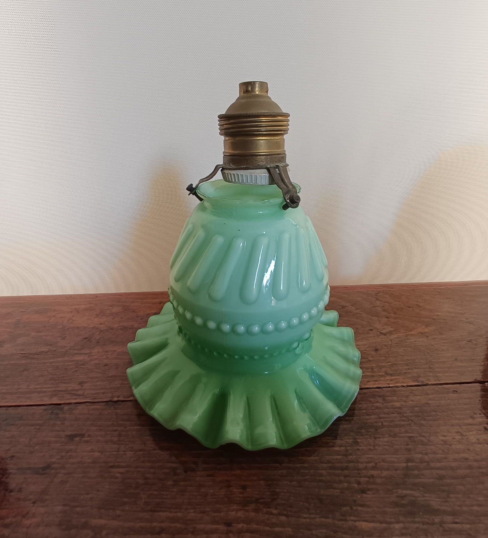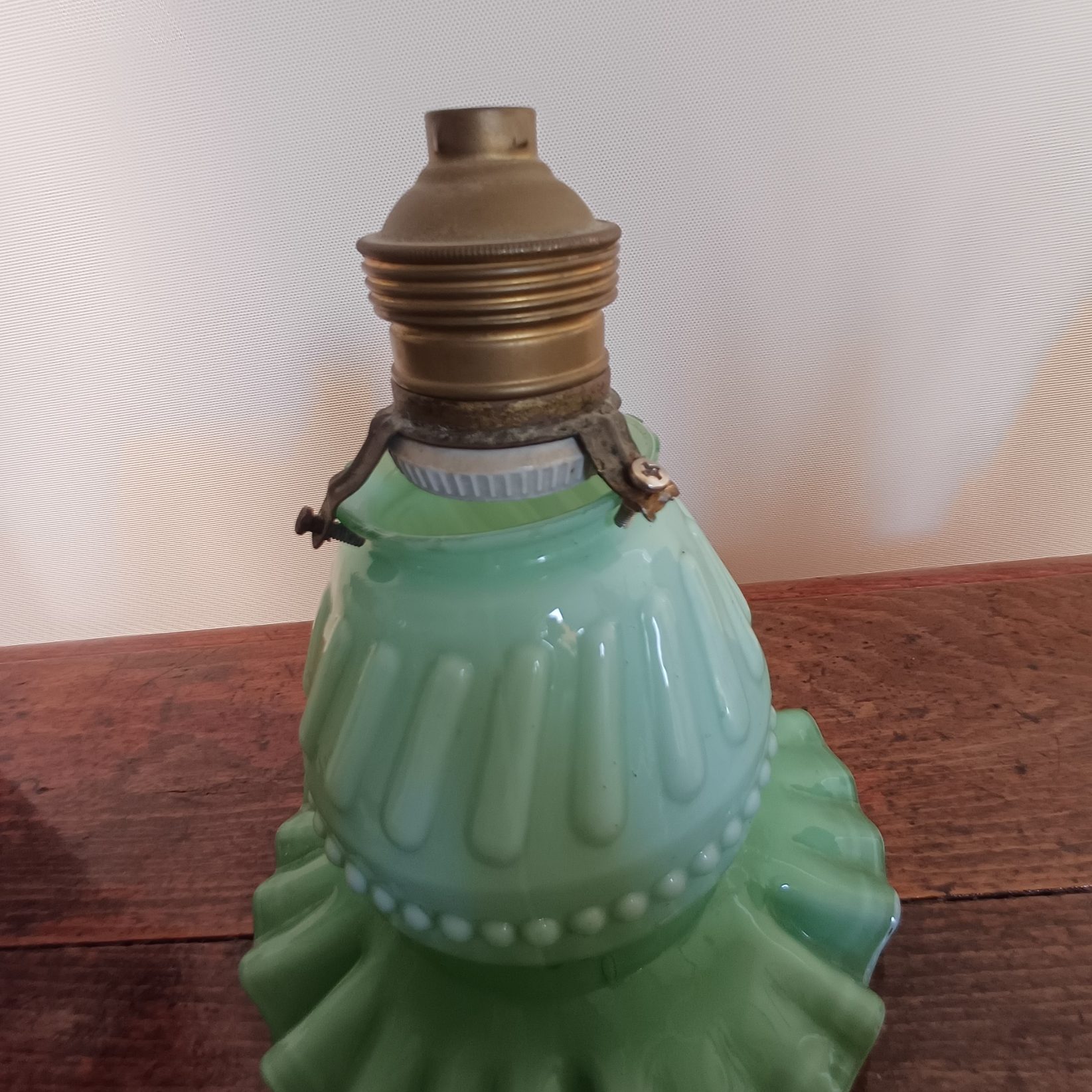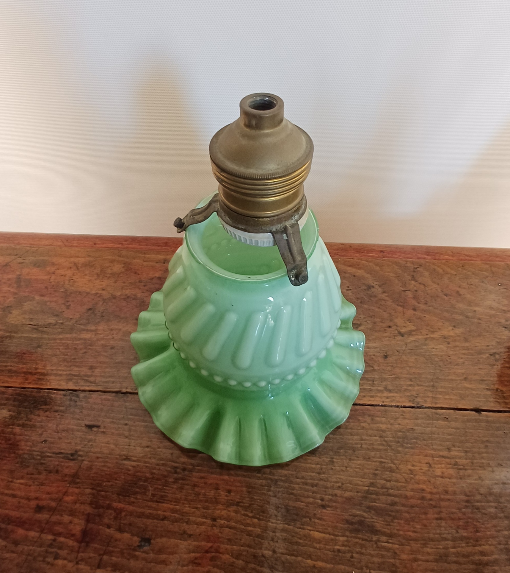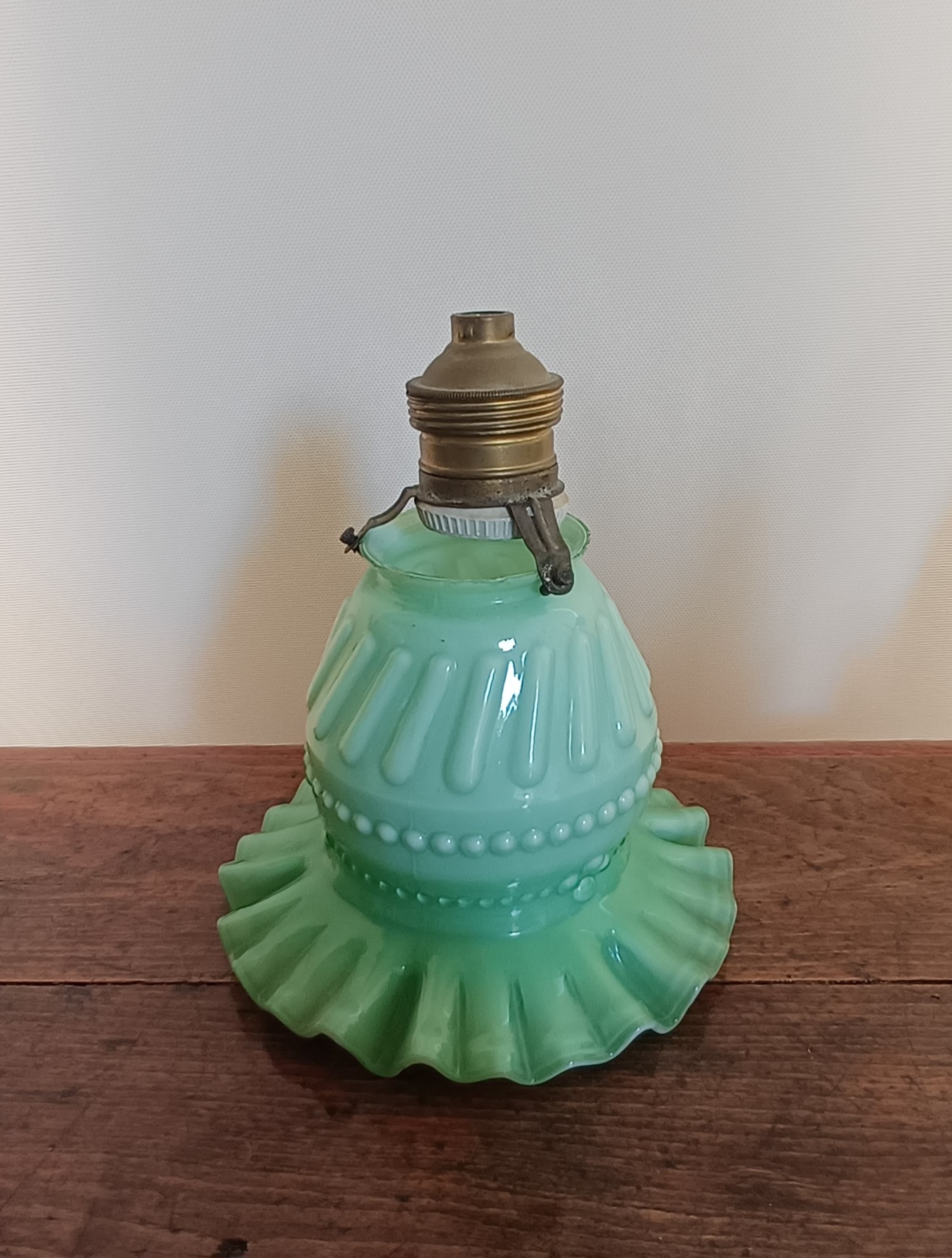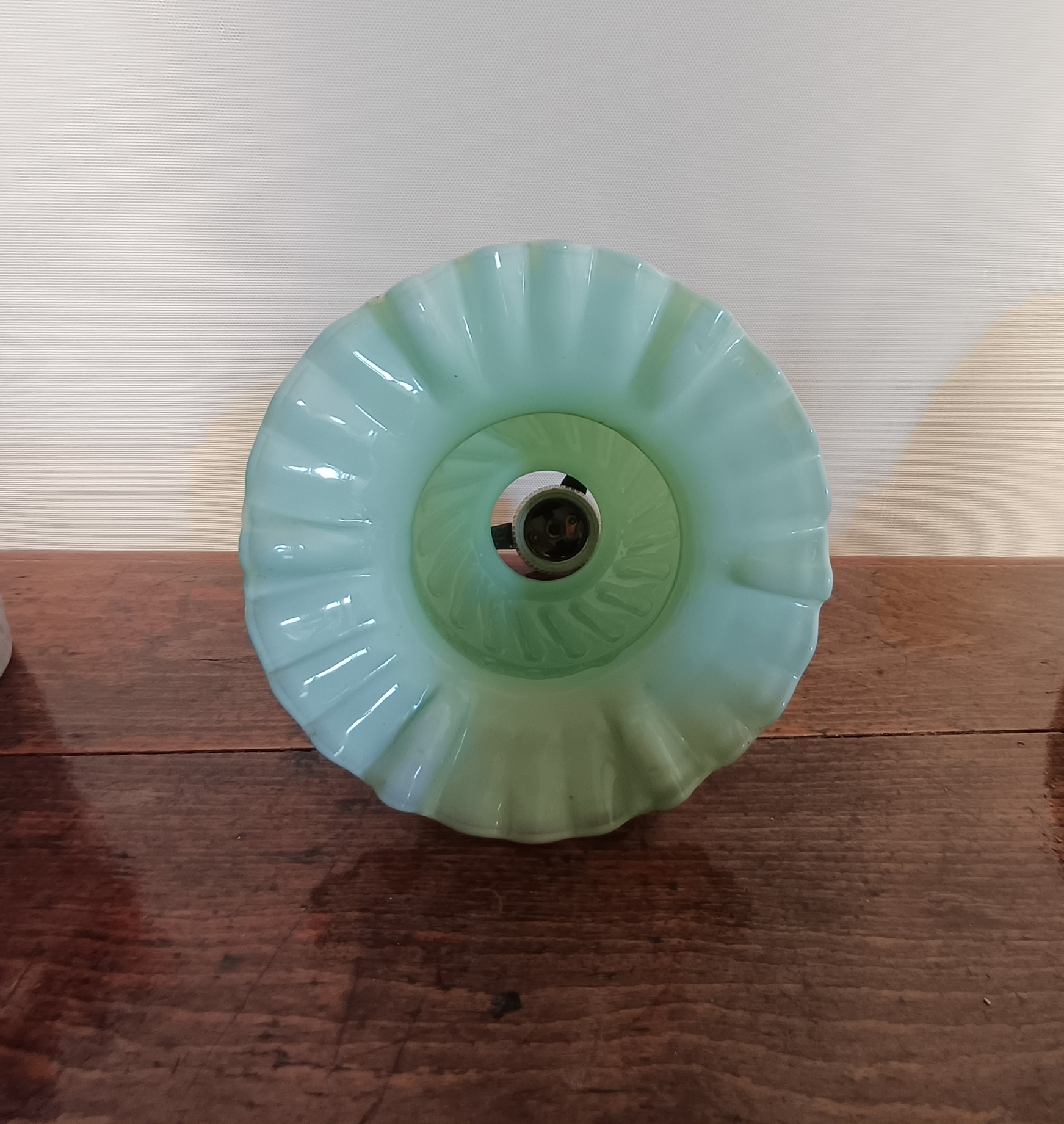 Antigua tulipa de cristal de opalina verde con araña y portalámparas.