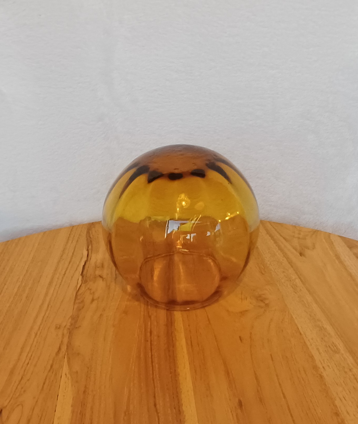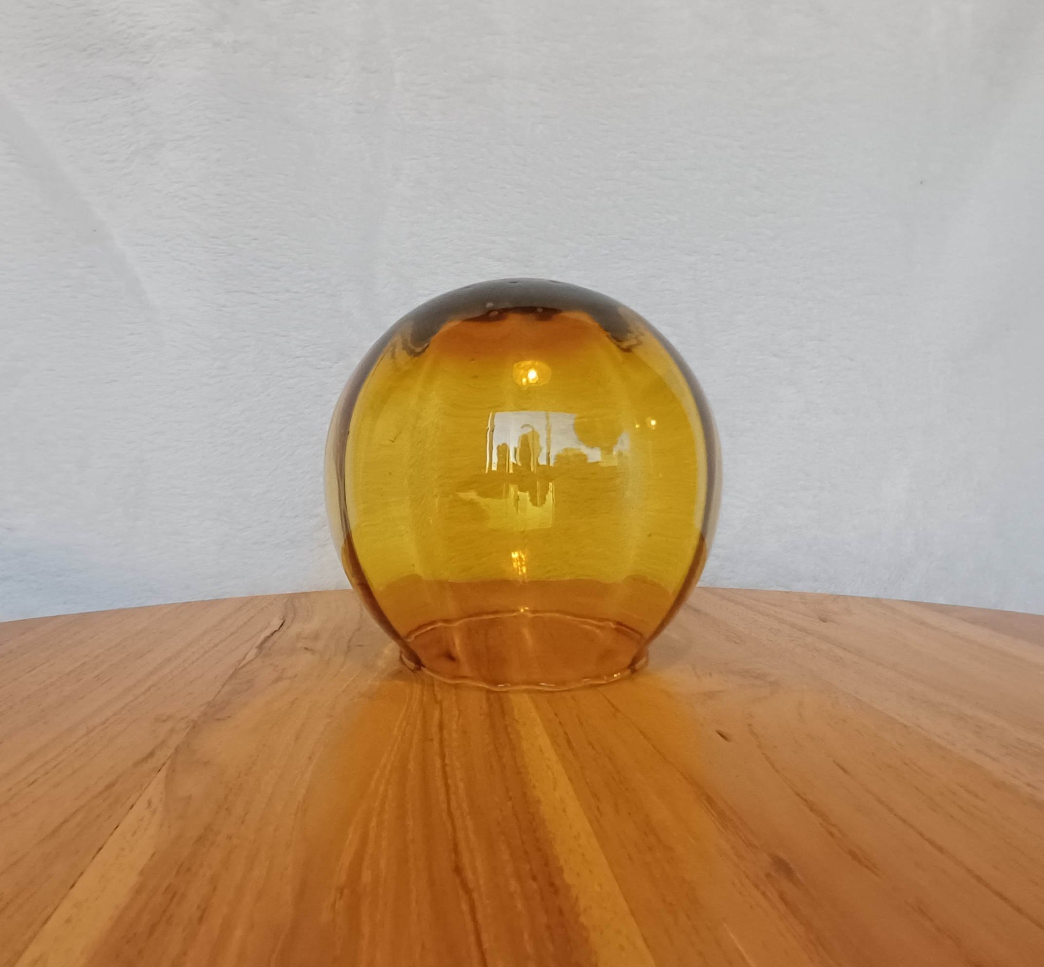 Tulipa esférica para lámpara, en vidrio soplado de color ámbar y ligeramente acanalado. 11 cm de diámetro. Ancho de la boca: 7,5 cm